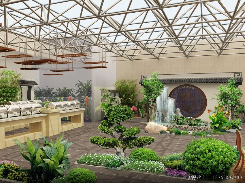 生態(tài)餐廳是綜合運用建筑學、園林學、設施園藝學、生態(tài)學等相關學科知識進行規(guī)劃、設計和建設,以設施調控技術、農藝栽培及管理技術來維護餐廳的優(yōu)美環(huán)境,形成以綠色景觀植物為主,蔬、果、花、草、藥為輔的植物配置格局,結合假山、瀑布、小橋流水、竹木亭閣等園林景觀,全方位立體展現(xiàn)綠色、優(yōu)美、宜人的就餐環(huán)境。